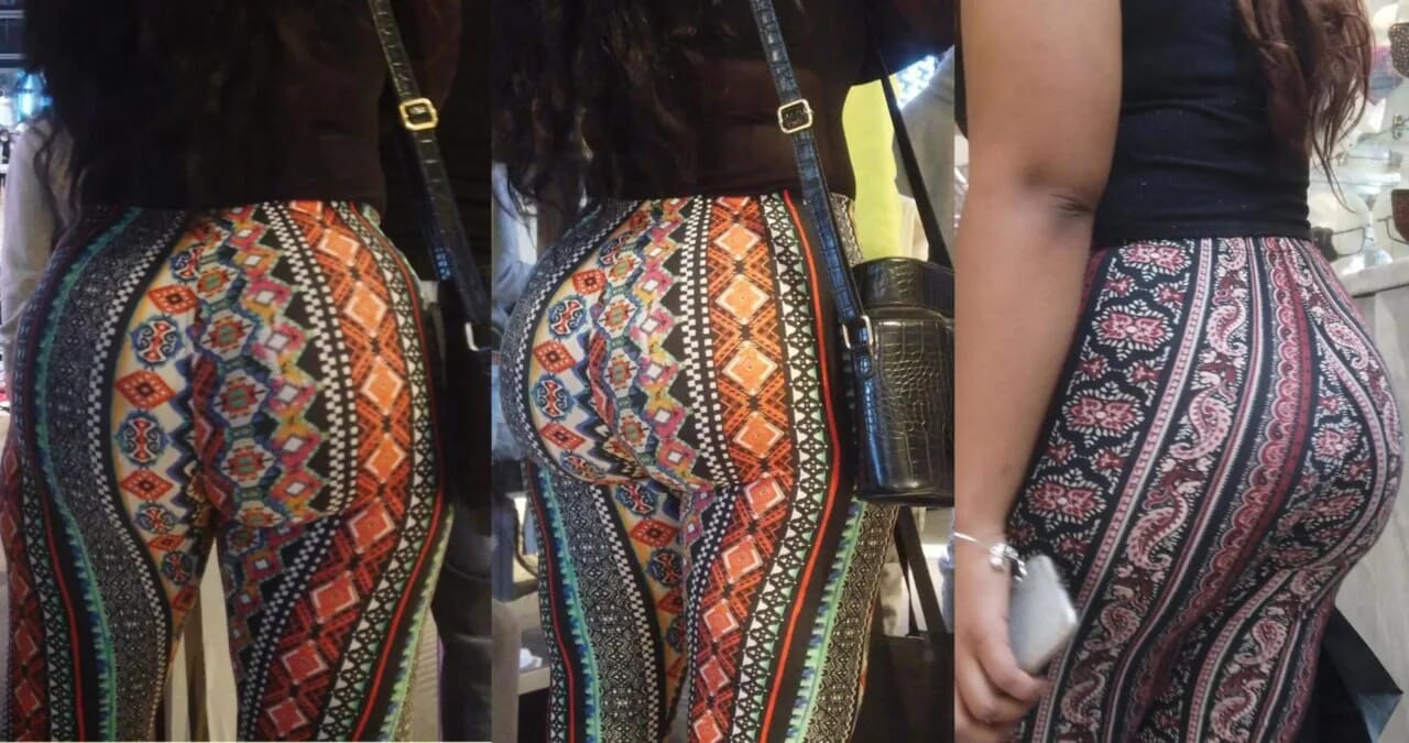 When she sits, that peach spreads just right —pure perfection in motion. Those curves hug the stool like they were made for it.