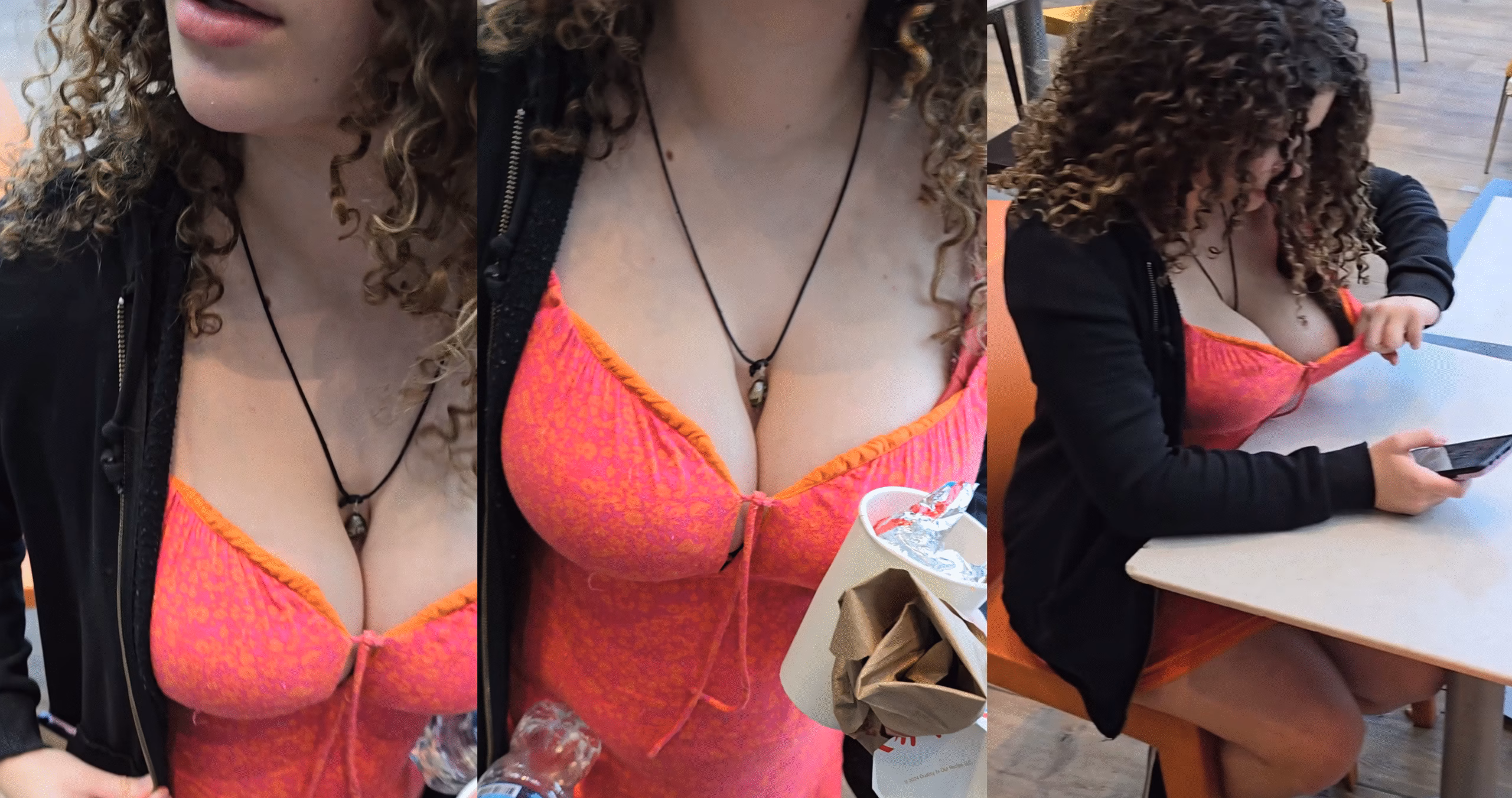 She lookin’ sweet—curls soft, skin glowin’, dress sittin’ all innocent… but that juicy ass cleavage? Yeah, she playin’ dirty in disguise. Walkin’ like a princess, sittin’ like a problem.